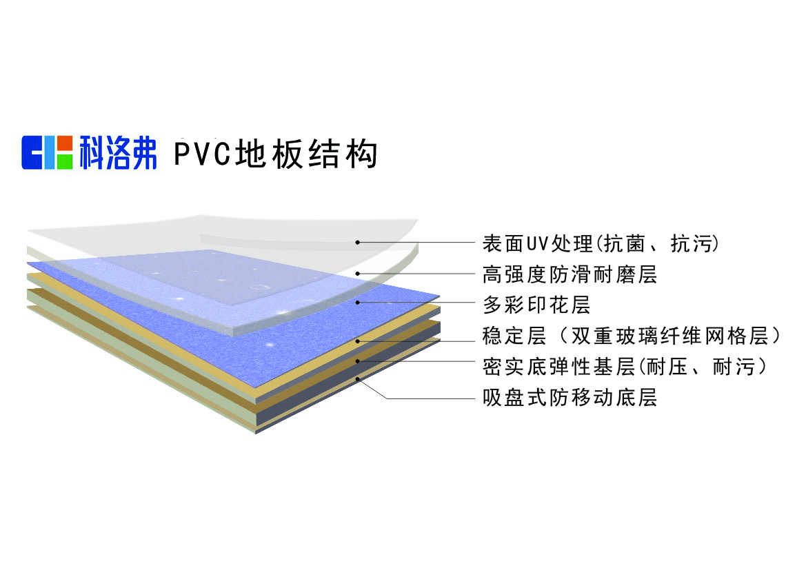 科洛弗PVC 塑膠地板主要材料為pvc(聚氯乙烯)樹脂,從結(jié)構(gòu)上分主要有多層復(fù)合型和同質(zhì)透心型及半同質(zhì)體型3種。其中多層復(fù)合型PVC地板的意思是它有多層結(jié)構(gòu)的,一般是由4-6層結(jié)構(gòu)疊壓而成,具體為:耐磨層(含UV處理)、印花膜層、玻璃纖維層、 彈性發(fā)泡層、磨壓層、基層等。這些不同結(jié)構(gòu)經(jīng)過特殊處理,合而為一,使之具有很好的耐熱性、防潮性、質(zhì)量穩(wěn)定性、抗衰老、抗菌、靜音、耐磨、防火阻燃等優(yōu)點。