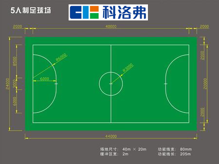 6、五人足球場地尺寸:主場+副場:長44米×寬24米,面積1056平米;主場:長40米×寬20米,面積800平米。